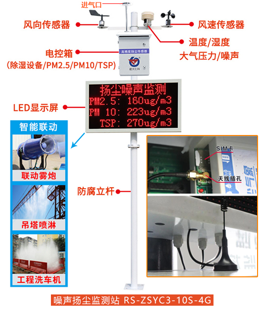 由于建筑工地往往集中于人口密集的城市地區(qū),因此工地?fù)P塵對(duì)空氣質(zhì)量的影響日益受到關(guān)注,為了有效監(jiān)控建筑工地?fù)P塵污染,接受市民的監(jiān)督和投訴,共建綠色環(huán)保建筑工地。基于這些原因,我們不僅要監(jiān)測(cè)工地上的PM2.5,還要對(duì)溫濕度、PM10、噪聲、風(fēng)速風(fēng)向等環(huán)境數(shù)據(jù)進(jìn)行在線監(jiān)測(cè)。