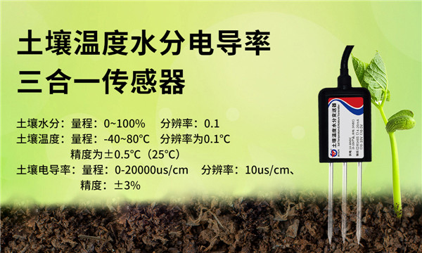 土壤溫度水分電導(dǎo)率三合一傳感器的殼體使用黑色阻燃環(huán)氧樹脂完全密封,采用三頭探針式外觀設(shè)計,探針為采用特殊處理的合金材料制作的電極,耐酸堿腐蝕,能夠采集土壤含水率、電導(dǎo)率及溫度等三個參數(shù),響應(yīng)快,精度高,互換性好,內(nèi)置溫度補償傳感器,補償范圍 0-50℃。