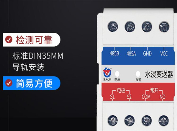 建大仁科卡軌殼水浸傳感器(RS-SJ-N01R01-4)采用獨(dú)有的交流采樣技術(shù),準(zhǔn)確區(qū)分是否發(fā)生水浸,因?yàn)椴捎媒蛔冸娏鳈z測(cè),電極即使長(zhǎng)時(shí)間浸泡也不會(huì)產(chǎn)生電泳極化,不依賴特殊電極,做到壽命長(zhǎng)、檢測(cè)可靠。采用 485 通信接口標(biāo)準(zhǔn) Mobus-RTU通信協(xié)議,可接入現(xiàn)場(chǎng)組態(tài)系統(tǒng)或 PLC;帶有1路繼電器常開(kāi)點(diǎn)輸出,方便接入現(xiàn)場(chǎng)設(shè)備,標(biāo)準(zhǔn) DIN35mm導(dǎo)軌安裝,安裝方便。