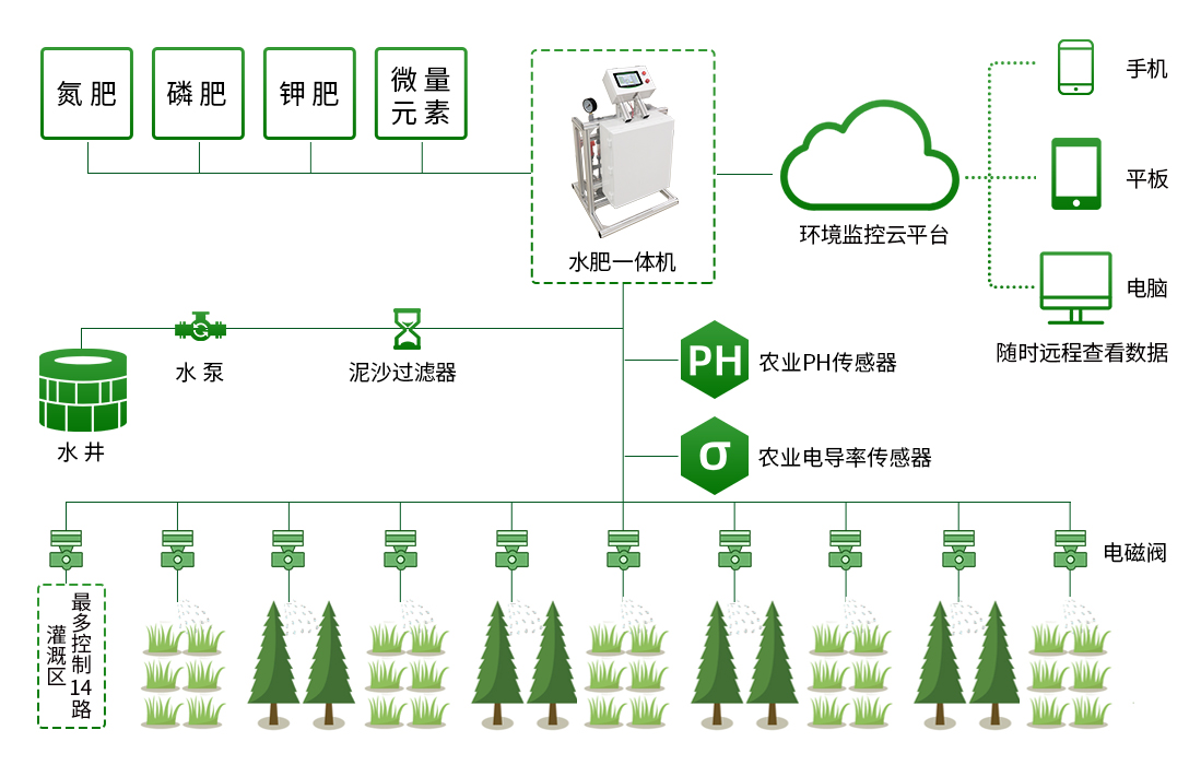 智能水肥一體化系統(tǒng):與傳統(tǒng)的灌溉方法相比,仁科水肥一體化智能灌溉系統(tǒng)采用傳感器、物聯(lián)網(wǎng)、云計算等多項(xiàng)技術(shù),集灌溉和施肥于一體,由水肥一體機(jī)、土壤墑情采集終端(土壤溫度水分電導(dǎo)率三合一變送器、土壤氮磷鉀變送器、土壤PH變送器)、過濾系統(tǒng)、閥門控制器、電磁閥、田間管路、監(jiān)控軟件云平臺組成,具有節(jié)水節(jié)肥、節(jié)省人力的特點(diǎn)。